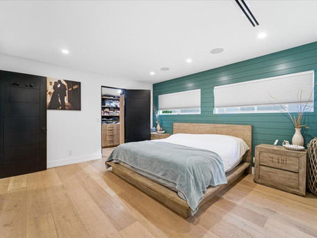 This master bedroom was designed with one goal in mind — give our clients a space that feels like a warm hug at the end of every day. The bold teal shiplap accent wall brings life and personality, while wide-plank hardwood floors and natural wood furnishings keep everything grounded and calm.