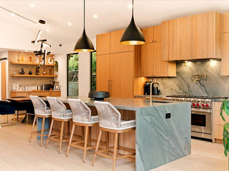 We transformed this space into a kitchen that doesn't just cook meals — it creates memories. Blue marble waterfall island, custom wood cabinetry, and a chef-grade range.